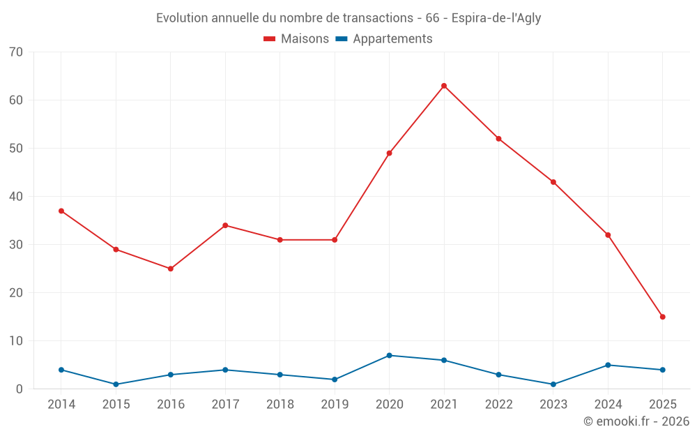 Le prix médian sur les 31 transactions de maisons des 12 derniers mois dans la commune d'Espira-de-l'Agly était de 1 745 € par mètre carré pour une valeur foncière médiane de 149 000 €. Sur cette période 60% des transactions se sont situées entre 1 185 et 2 926 € par mètre carré (du 2ème au 8ème déciles).