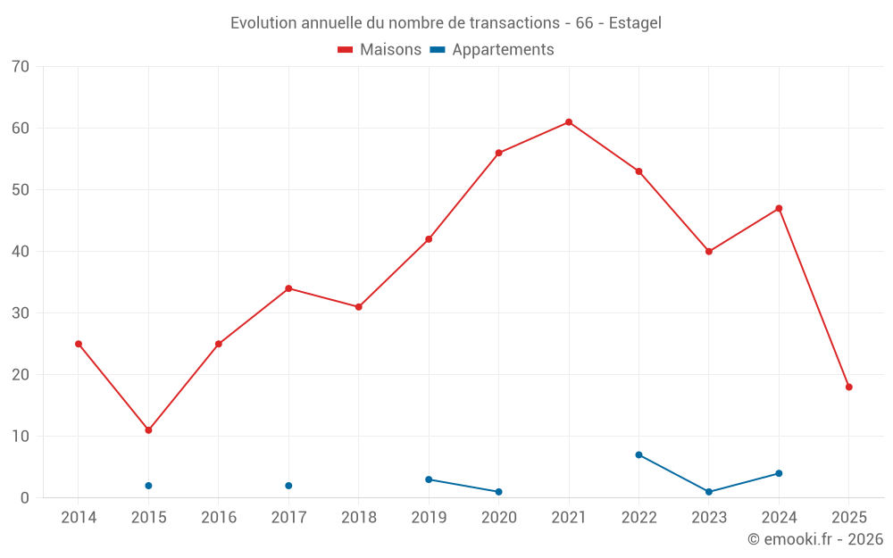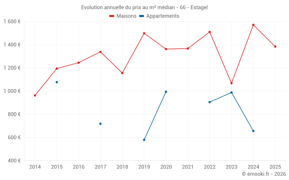 Le prix médian sur les 18 transactions de maisons des 6 derniers mois dans la commune d'Estagel était de 1 384 € par mètre carré pour une valeur foncière médiane de 91 000 €. Sur cette période 60% des transactions se sont situées entre 972 et 1 753 € par mètre carré (du 2ème au 8ème déciles).