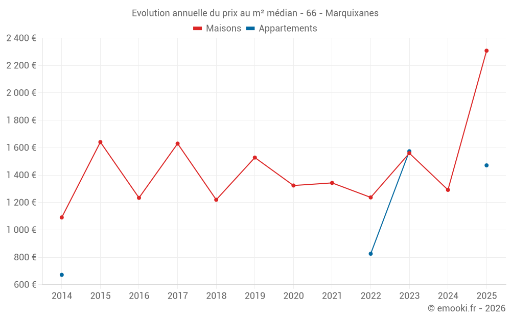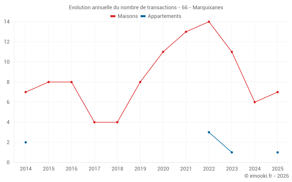 Le prix médian sur les 17 transactions de maisons des 24 derniers mois dans la commune de Marquixanes était de 1 585 € par mètre carré pour une valeur foncière médiane de 120 000 €. Sur cette période 60% des transactions se sont situées entre 836 et 2 270 € par mètre carré (du 2ème au 8ème déciles).