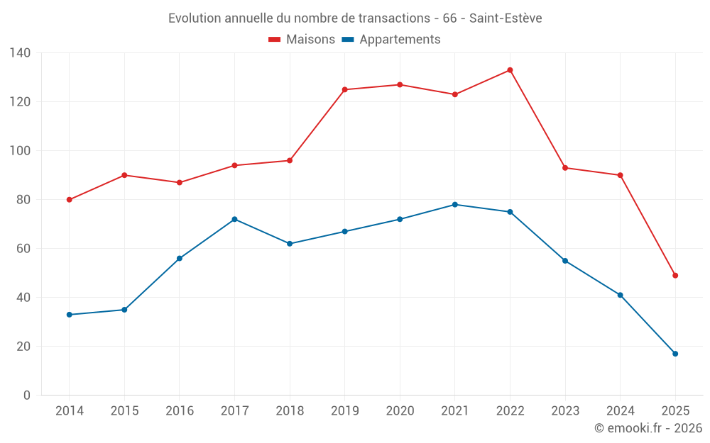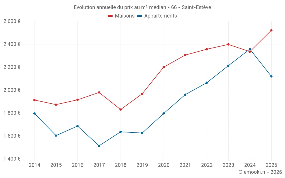 Le prix médian sur les 49 transactions de maisons des 6 derniers mois dans la commune de Saint-Estève était de 2 521 € par mètre carré pour une valeur foncière médiane de 212 000 €. Sur cette période 60% des transactions se sont situées entre 2 006 et 3 111 € par mètre carré (du 2ème au 8ème déciles).
