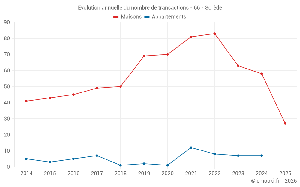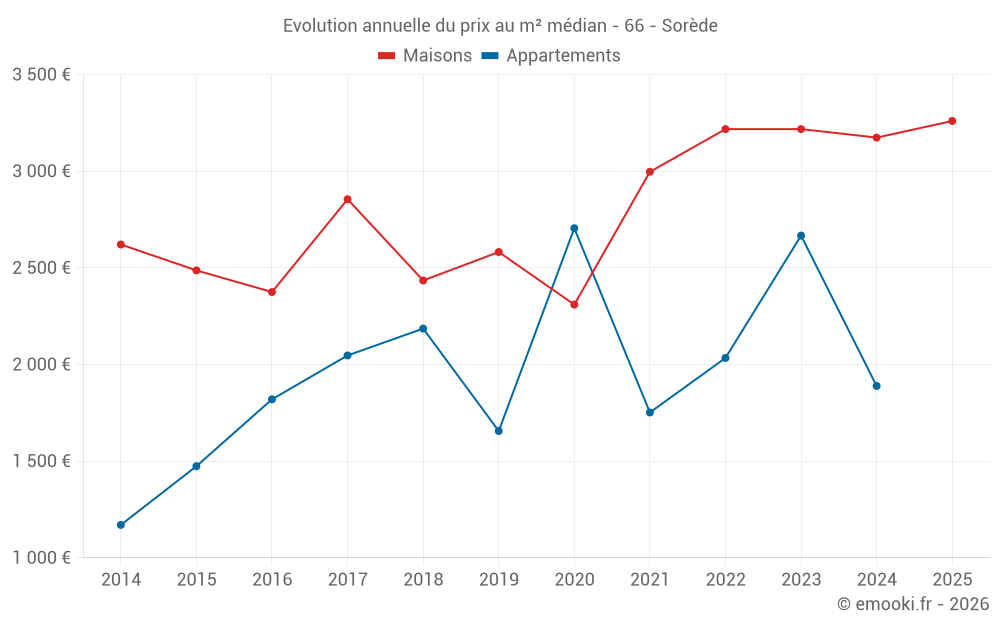 Le prix médian sur les 27 transactions de maisons des 6 derniers mois dans la commune de Sorède était de 3 260 € par mètre carré pour une valeur foncière médiane de 283 000 €. Sur cette période 60% des transactions se sont situées entre 2 781 et 3 656 € par mètre carré (du 2ème au 8ème déciles).