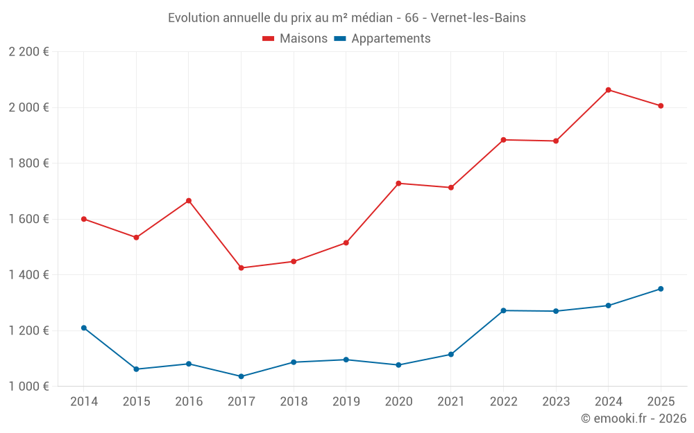 Le prix médian sur les 25 transactions de maisons des 12 derniers mois dans la commune de Vernet-les-Bains était de 1 928 € par mètre carré pour une valeur foncière médiane de 185 050 €. Sur cette période 60% des transactions se sont situées entre 1 407 et 2 455 € par mètre carré (du 2ème au 8ème déciles).