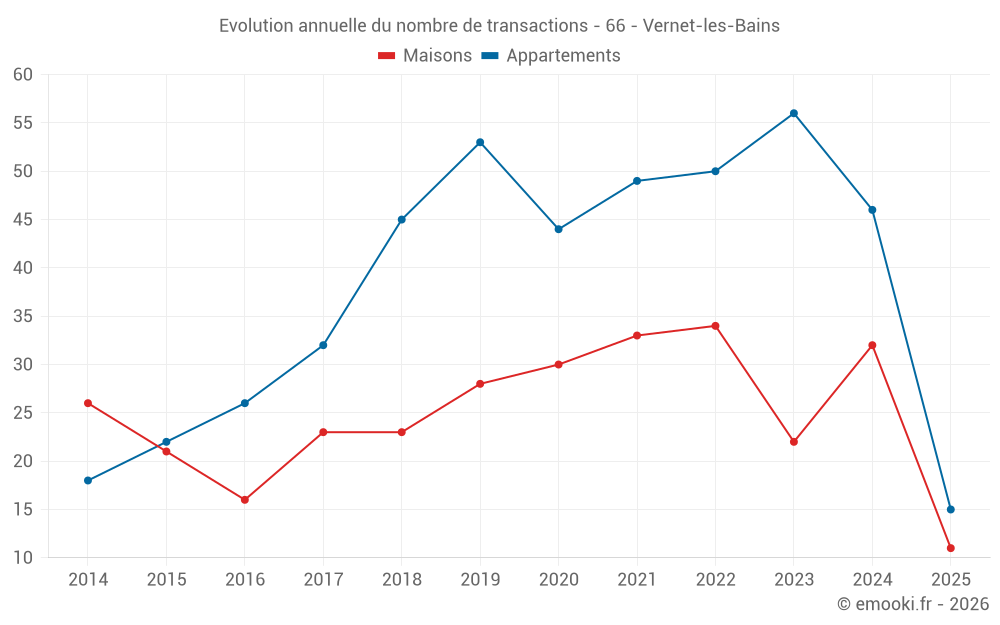 Le prix médian sur les 39 transactions d'appartements des 12 derniers mois dans la commune de Vernet-les-Bains était de 1 325 € par mètre carré pour une valeur foncière médiane de 56 500 €. Sur cette période 60% des transactions se sont situées entre 1 069 et 1 595 € par mètre carré (du 2ème au 8ème déciles).