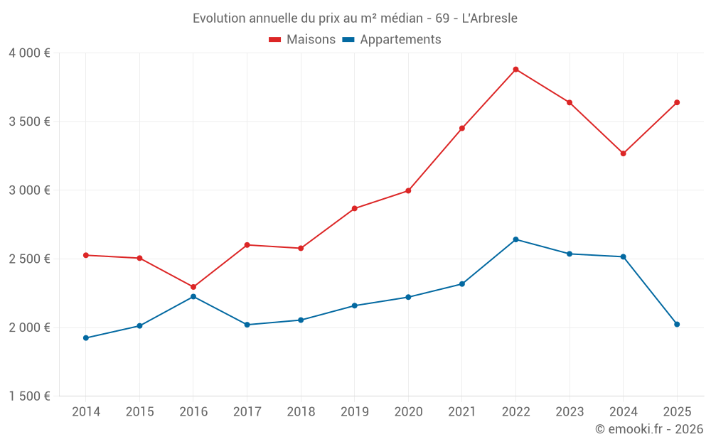 Le prix médian sur les 26 transactions d'appartements des 12 derniers mois dans la commune de l'Arbresle était de 2 202 € par mètre carré pour une valeur foncière médiane de 155 000 €. Sur cette période 60% des transactions se sont situées entre 1 723 et 2 947 € par mètre carré (du 2ème au 8ème déciles).