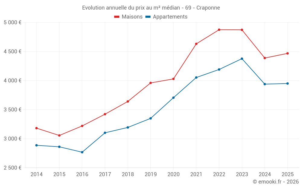 Le prix médian sur les 25 transactions de maisons des 6 derniers mois dans la commune de Craponne était de 4 468 € par mètre carré pour une valeur foncière médiane de 482 400 €. Sur cette période 60% des transactions se sont situées entre 3 921 et 5 203 € par mètre carré (du 2ème au 8ème déciles).