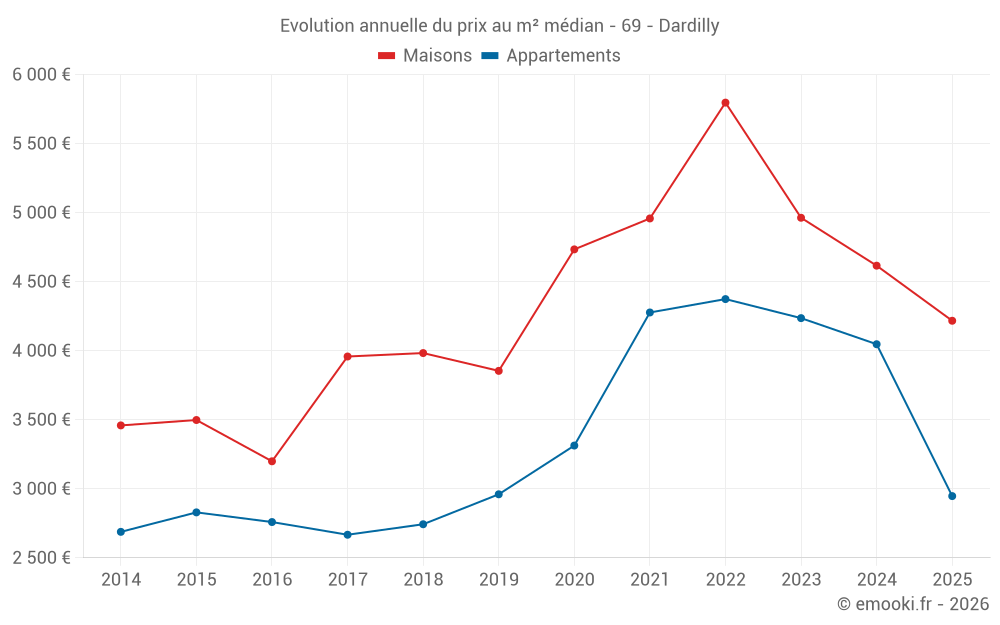 Le prix médian sur les 25 transactions de maisons des 6 derniers mois dans la commune de Dardilly était de 4 217 € par mètre carré pour une valeur foncière médiane de 575 200 €. Sur cette période 60% des transactions se sont situées entre 3 523 et 5 079 € par mètre carré (du 2ème au 8ème déciles).