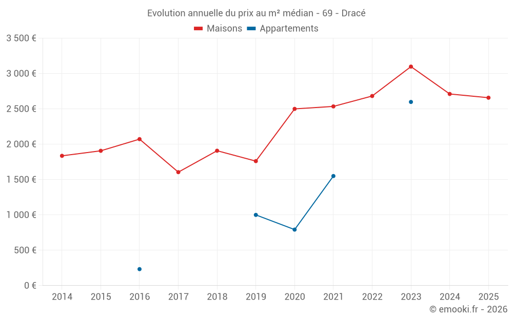 Le prix médian sur les 20 transactions de maisons des 24 derniers mois dans la commune de Dracé était de 2 917 € par mètre carré pour une valeur foncière médiane de 290 000 €. Sur cette période 60% des transactions se sont situées entre 2 514 et 3 153 € par mètre carré (du 2ème au 8ème déciles).