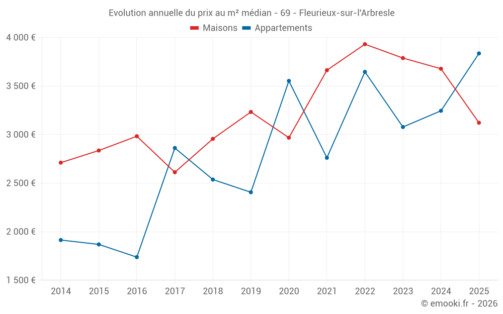 Le prix médian sur les 22 transactions d'appartements des 24 derniers mois dans la commune de Fleurieux-sur-l'Arbresle était de 3 279 € par mètre carré pour une valeur foncière médiane de 238 575 €. Sur cette période 60% des transactions se sont situées entre 2 859 et 4 179 € par mètre carré (du 2ème au 8ème déciles).