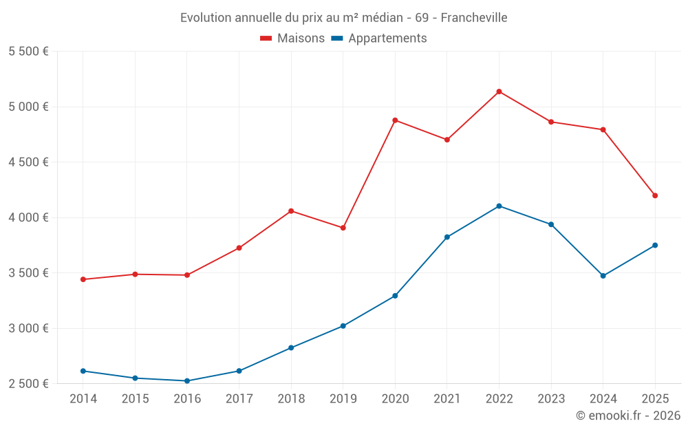 Le prix médian sur les 28 transactions de maisons des 6 derniers mois dans la commune de Francheville était de 4 198 € par mètre carré pour une valeur foncière médiane de 469 248 €. Sur cette période 60% des transactions se sont situées entre 3 204 et 5 048 € par mètre carré (du 2ème au 8ème déciles).