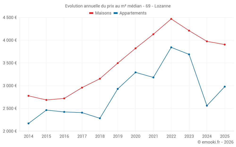 Le prix médian sur les 29 transactions de maisons des 24 derniers mois dans la commune de Lozanne était de 4 105 € par mètre carré pour une valeur foncière médiane de 446 850 €. Sur cette période 60% des transactions se sont situées entre 2 964 et 4 596 € par mètre carré (du 2ème au 8ème déciles).