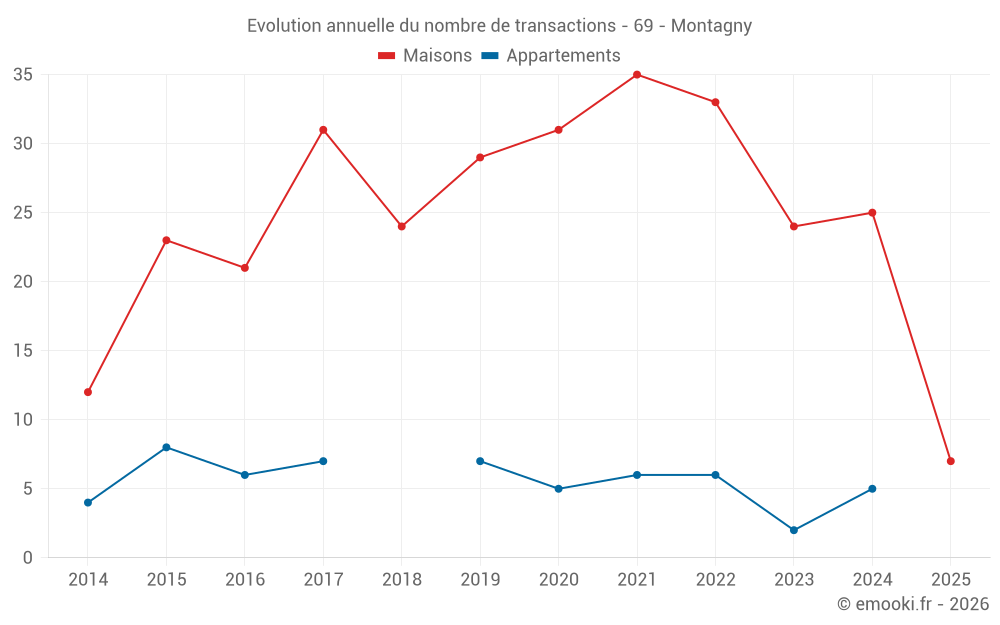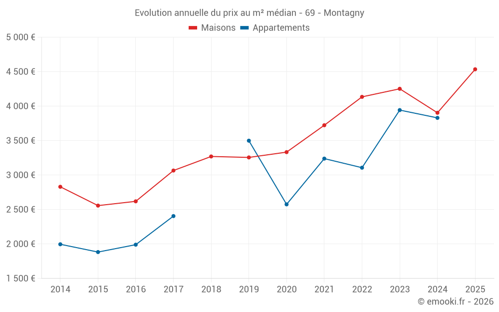 Le prix médian sur les 22 transactions de maisons des 12 derniers mois dans la commune de Montagny était de 4 006 € par mètre carré pour une valeur foncière médiane de 423 575 €. Sur cette période 60% des transactions se sont situées entre 3 541 et 4 582 € par mètre carré (du 2ème au 8ème déciles).