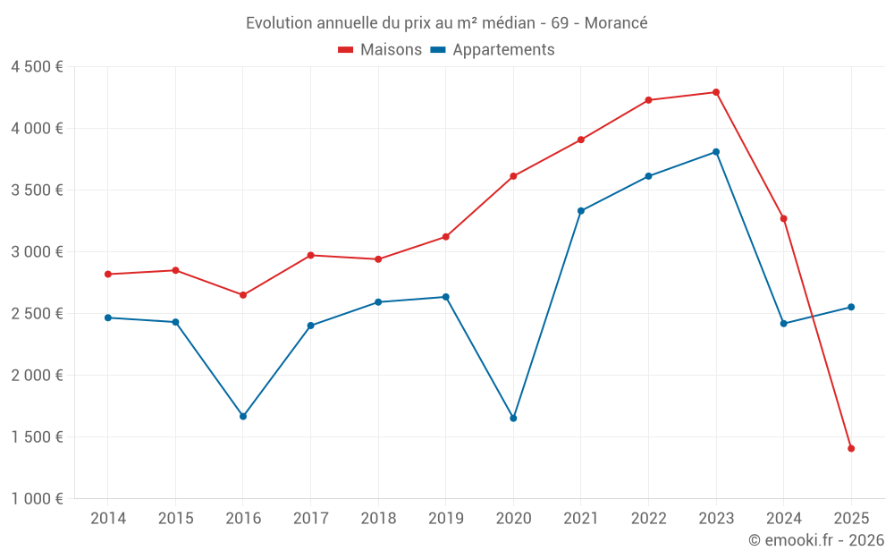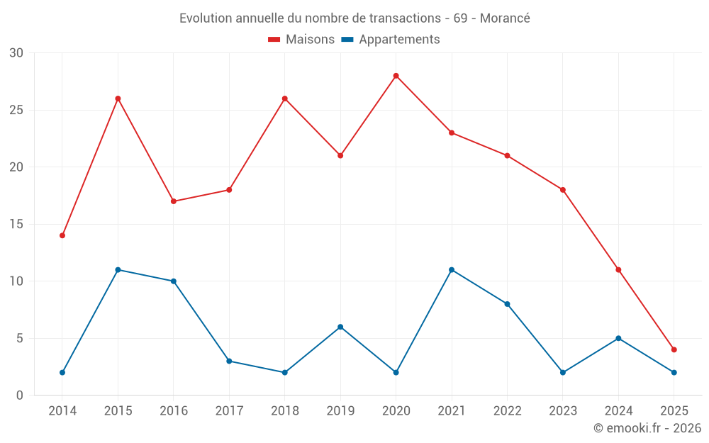 Le prix médian sur les 26 transactions de maisons des 24 derniers mois dans la commune de Morancé était de 3 444 € par mètre carré pour une valeur foncière médiane de 426 500 €. Sur cette période 60% des transactions se sont situées entre 2 746 et 4 555 € par mètre carré (du 2ème au 8ème déciles).