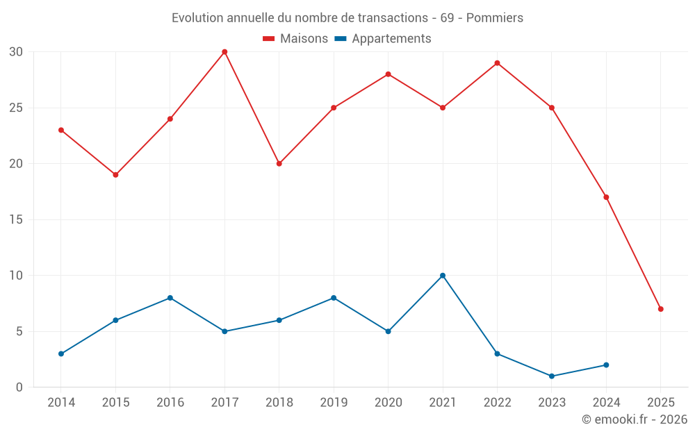 Le prix médian sur les 18 transactions de maisons des 12 derniers mois dans la commune de Pommiers était de 3 584 € par mètre carré pour une valeur foncière médiane de 469 550 €. Sur cette période 60% des transactions se sont situées entre 3 066 et 4 343 € par mètre carré (du 2ème au 8ème déciles).