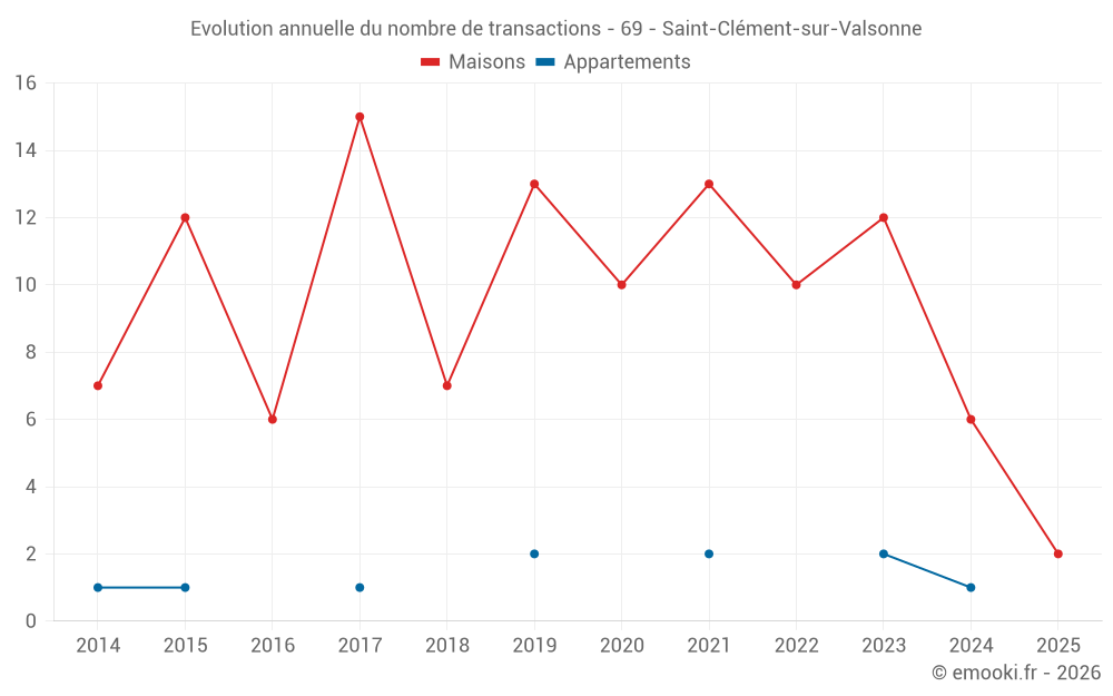 Le prix médian sur les 16 transactions de maisons des 24 derniers mois dans la commune de Saint-Clément-sur-Valsonne était de 1 898 € par mètre carré pour une valeur foncière médiane de 171 050 €. Sur cette période 60% des transactions se sont situées entre 815 et 2 931 € par mètre carré (du 2ème au 8ème déciles).