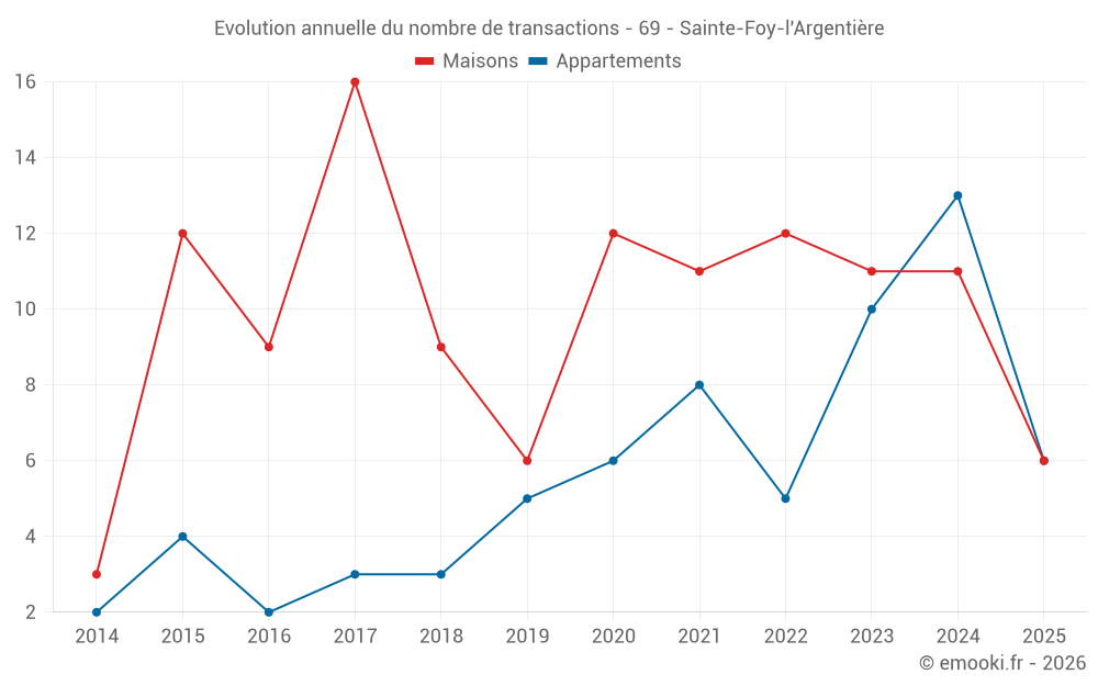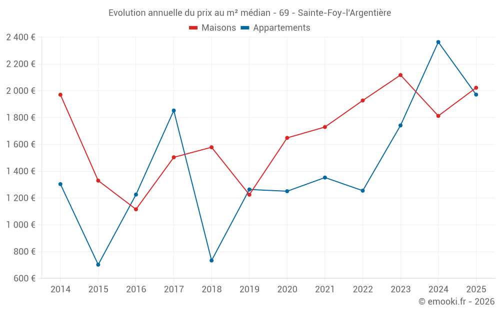 Le prix médian sur les 17 transactions de maisons des 24 derniers mois dans la commune de Sainte-Foy-l'Argentière était de 1 865 € par mètre carré pour une valeur foncière médiane de 190 000 €. Sur cette période 60% des transactions se sont situées entre 1 510 et 2 394 € par mètre carré (du 2ème au 8ème déciles).