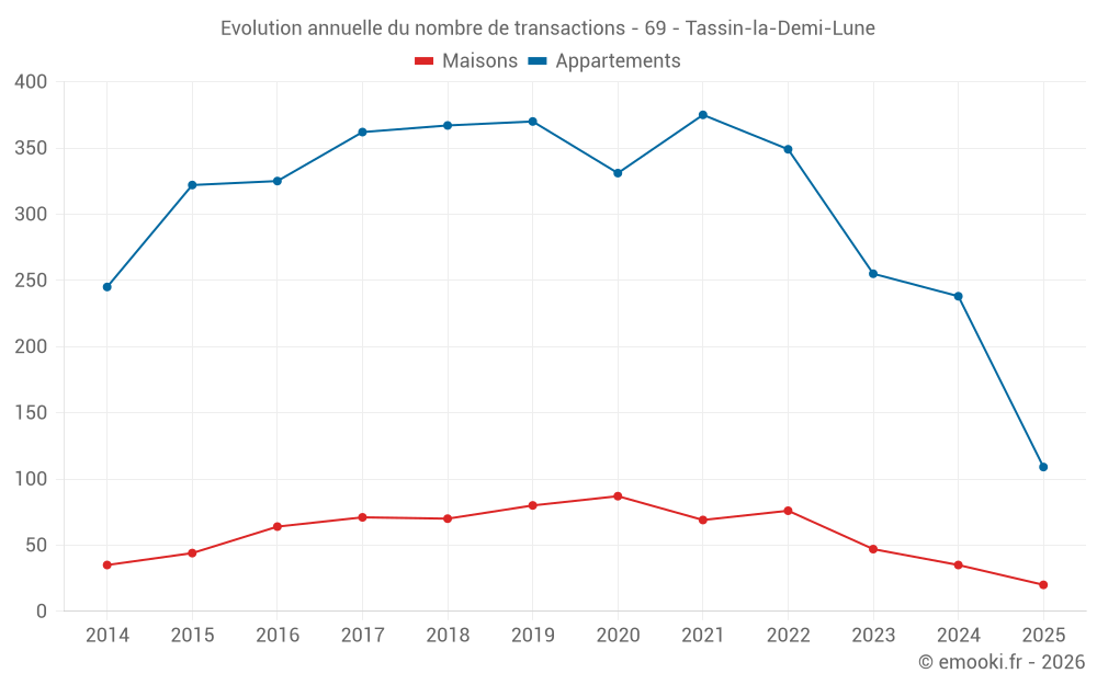 Le prix médian sur les 20 transactions de maisons des 6 derniers mois dans la commune de Tassin-la-Demi-Lune était de 5 327 € par mètre carré pour une valeur foncière médiane de 673 900 €. Sur cette période 60% des transactions se sont situées entre 3 760 et 6 706 € par mètre carré (du 2ème au 8ème déciles).