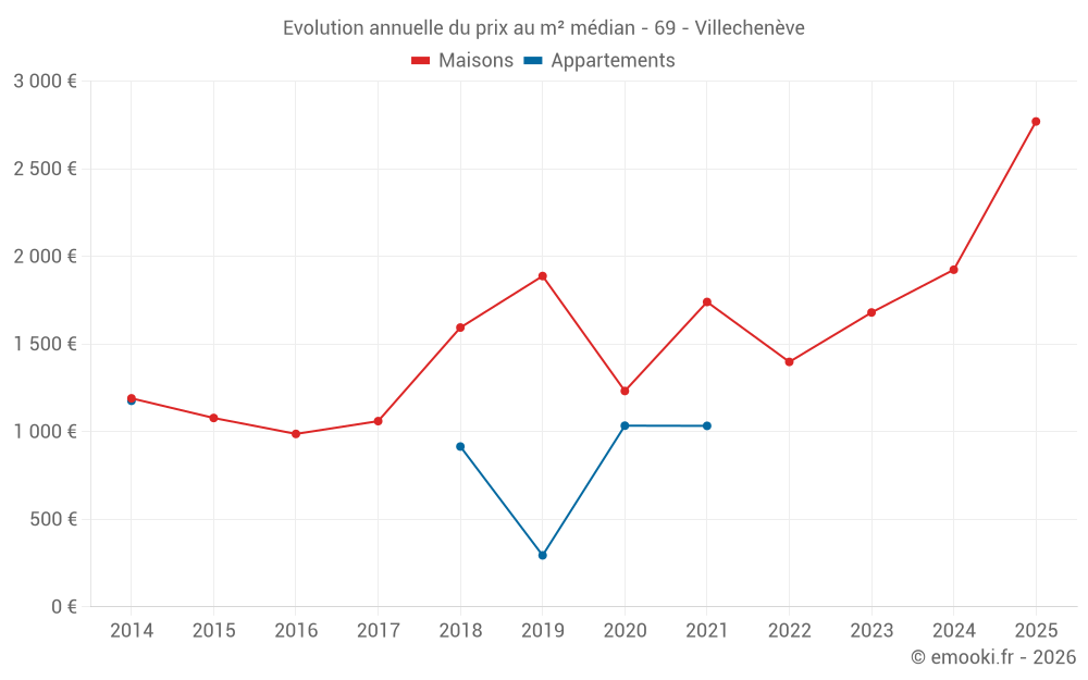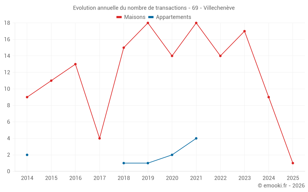 Le prix médian sur les 18 transactions de maisons des 24 derniers mois dans la commune de Villechenève était de 2 042 € par mètre carré pour une valeur foncière médiane de 216 800 €. Sur cette période 60% des transactions se sont situées entre 1 129 et 2 778 € par mètre carré (du 2ème au 8ème déciles).