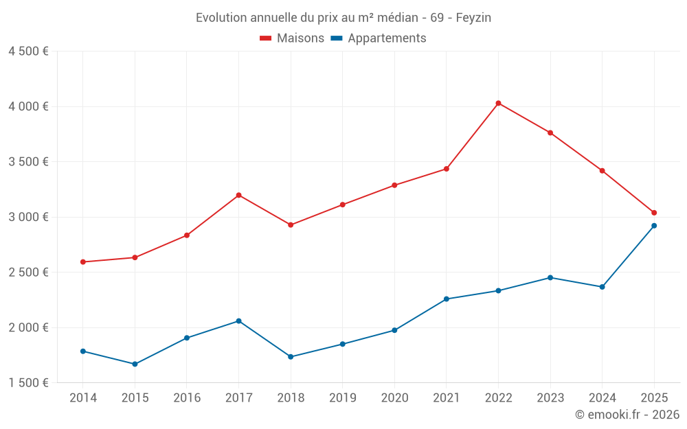 Le prix médian sur les 40 transactions d'appartements des 12 derniers mois dans la commune de Feyzin était de 2 300 € par mètre carré pour une valeur foncière médiane de 145 300 €. Sur cette période 60% des transactions se sont situées entre 1 781 et 3 299 € par mètre carré (du 2ème au 8ème déciles).