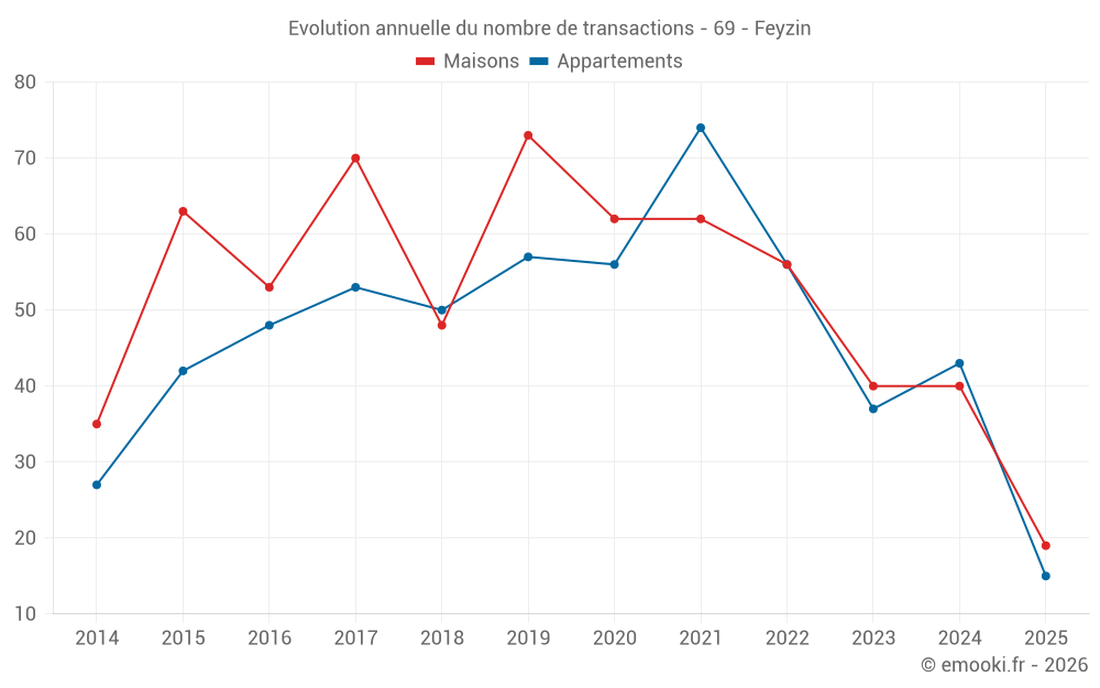 Le prix médian sur les 19 transactions de maisons des 6 derniers mois dans la commune de Feyzin était de 3 039 € par mètre carré pour une valeur foncière médiane de 348 550 €. Sur cette période 60% des transactions se sont situées entre 2 266 et 3 665 € par mètre carré (du 2ème au 8ème déciles).