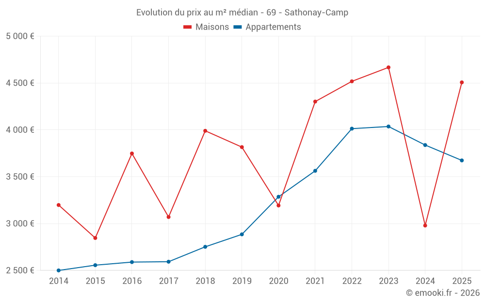Le prix médian sur les 17 transactions de maisons des 24 derniers mois dans la commune de Sathonay-Camp était de 3 796 € par mètre carré pour une valeur foncière médiane de 396 300 €. Sur cette période 60% des transactions se sont situées entre 2 960 et 4 884 € par mètre carré (du 2ème au 8ème déciles).