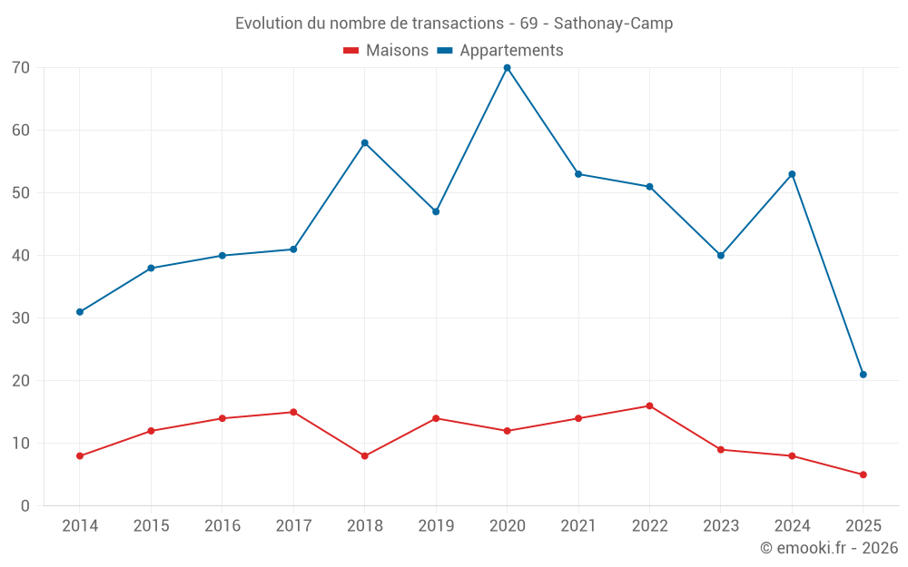 Le prix médian sur les 21 transactions d'appartements des 6 derniers mois dans la commune de Sathonay-Camp était de 3 674 € par mètre carré pour une valeur foncière médiane de 242 000 €. Sur cette période 60% des transactions se sont situées entre 2 683 et 4 190 € par mètre carré (du 2ème au 8ème déciles).