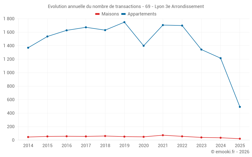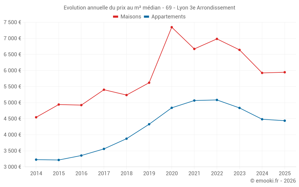 Le prix médian sur les 21 transactions de maisons des 6 derniers mois dans la commune de Lyon 3e Arrondissement était de 5 946 € par mètre carré pour une valeur foncière médiane de 725 400 €. Sur cette période 60% des transactions se sont situées entre 4 060 et 7 490 € par mètre carré (du 2ème au 8ème déciles).