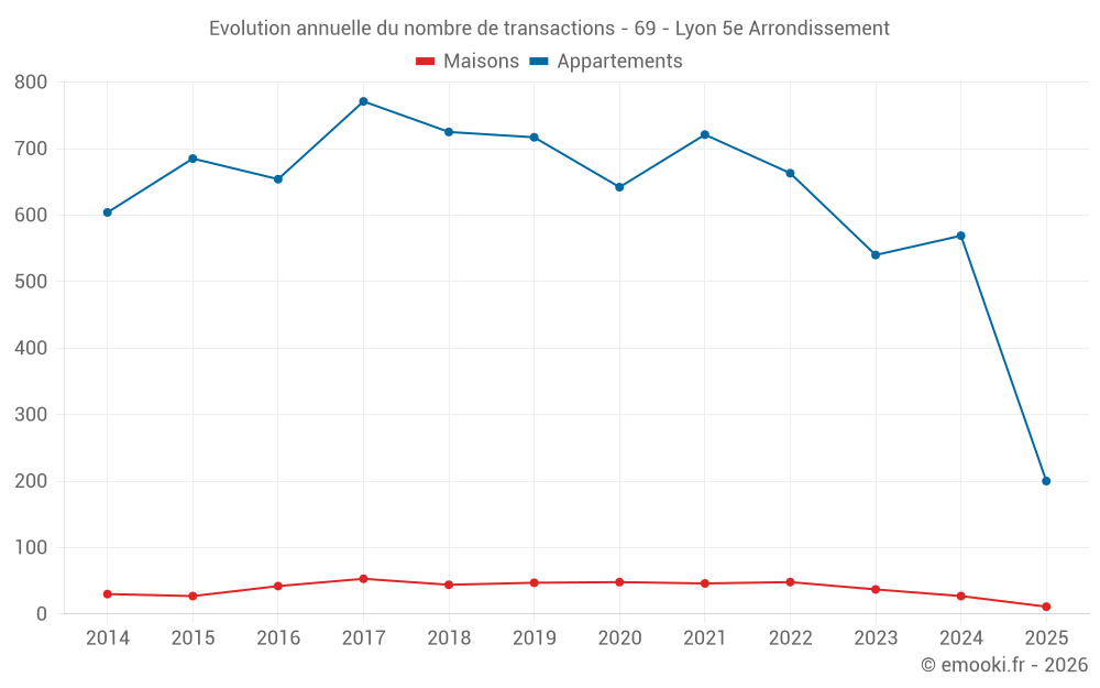 Le prix médian sur les 28 transactions de maisons des 12 derniers mois dans la commune de Lyon 5e Arrondissement était de 4 888 € par mètre carré pour une valeur foncière médiane de 530 700 €. Sur cette période 60% des transactions se sont situées entre 4 025 et 6 311 € par mètre carré (du 2ème au 8ème déciles).