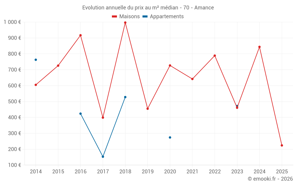 Le prix médian sur les 24 transactions de maisons des 24 derniers mois dans la commune d'Amance était de 512 € par mètre carré pour une valeur foncière médiane de 57 250 €. Sur cette période 60% des transactions se sont situées entre 260 et 995 € par mètre carré (du 2ème au 8ème déciles).