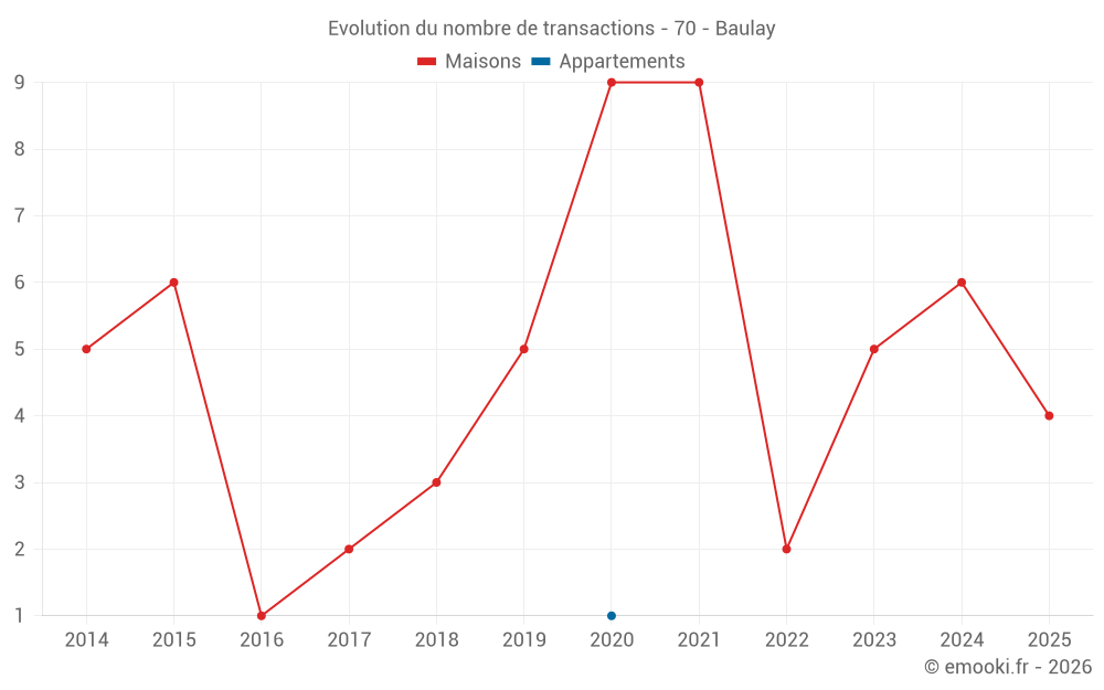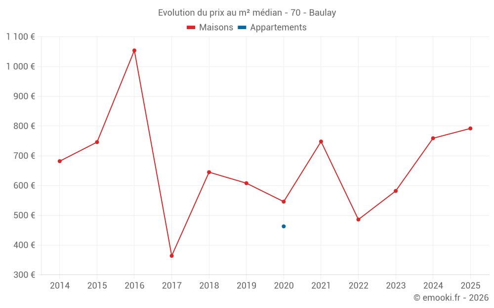 Le prix médian sur les 14 transactions de maisons des 24 derniers mois dans la commune de Baulay était de 759 € par mètre carré pour une valeur foncière médiane de 61 250 €. Sur cette période 60% des transactions se sont situées entre 425 et 1 085 € par mètre carré (du 2ème au 8ème déciles).