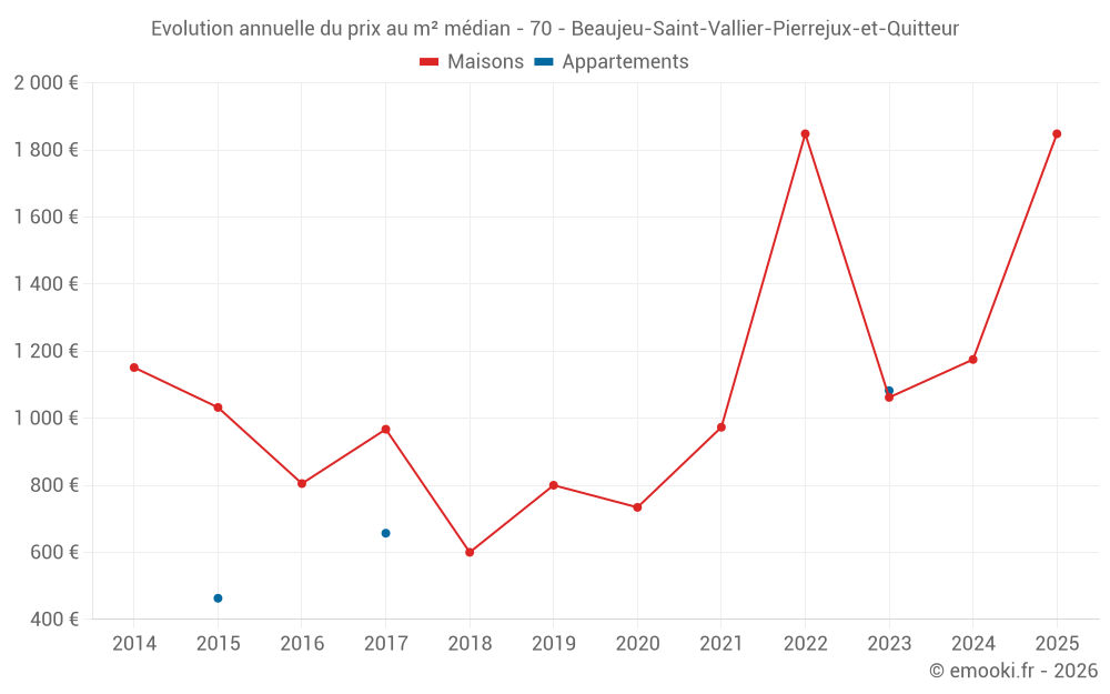 Le prix médian sur les 17 transactions de maisons des 24 derniers mois dans la commune de Beaujeu-Saint-Vallier-Pierrejux-et-Quitteur était de 1 175 € par mètre carré pour une valeur foncière médiane de 120 000 €. Sur cette période 60% des transactions se sont situées entre 718 et 2 000 € par mètre carré (du 2ème au 8ème déciles).