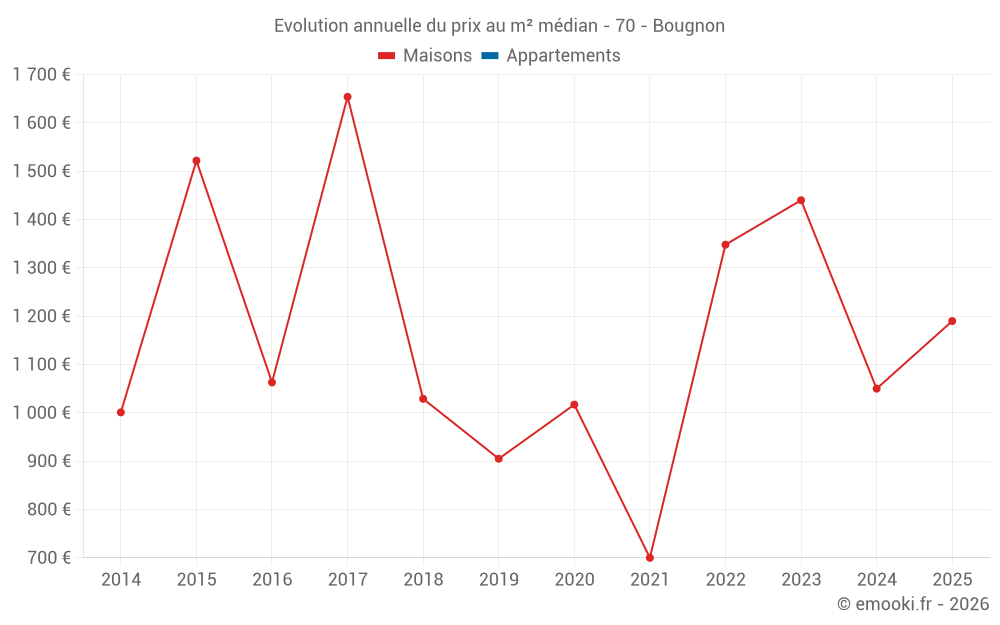 Le prix médian sur les 16 transactions de maisons des 24 derniers mois dans la commune de Bougnon était de 1 404 € par mètre carré pour une valeur foncière médiane de 148 250 €. Sur cette période 60% des transactions se sont situées entre 722 et 1 552 € par mètre carré (du 2ème au 8ème déciles).