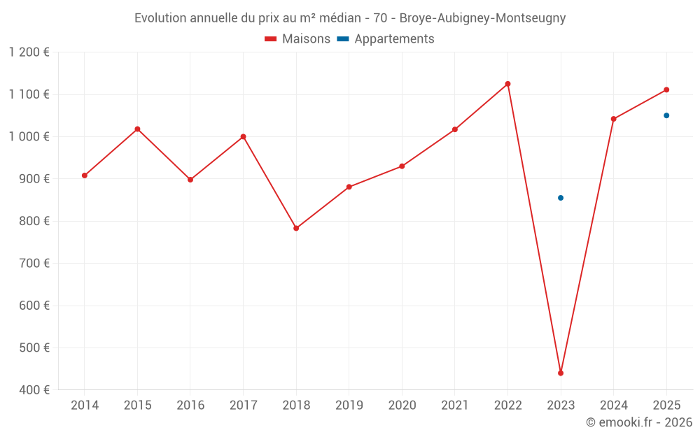 Le prix médian sur les 15 transactions de maisons des 24 derniers mois dans la commune de Broye-Aubigney-Montseugny était de 1 000 € par mètre carré pour une valeur foncière médiane de 100 000 €. Sur cette période 60% des transactions se sont situées entre 467 et 1 533 € par mètre carré (du 2ème au 8ème déciles).