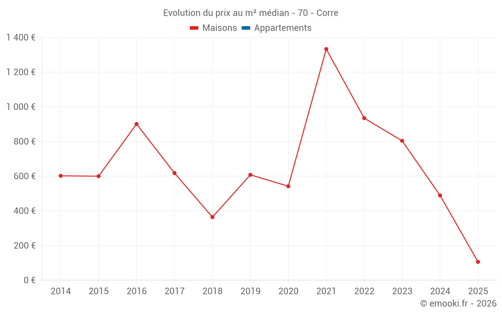 Le prix médian sur les 14 transactions de maisons des 24 derniers mois dans la commune de Corre était de 546 € par mètre carré pour une valeur foncière médiane de 65 275 €. Sur cette période 60% des transactions se sont situées entre 341 et 1 138 € par mètre carré (du 2ème au 8ème déciles).