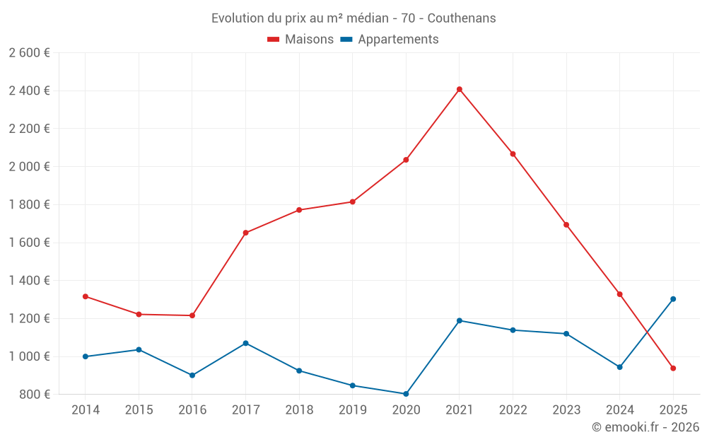 Le prix médian sur les 18 transactions de maisons des 24 derniers mois dans la commune de Couthenans était de 1 414 € par mètre carré pour une valeur foncière médiane de 130 000 €. Sur cette période 60% des transactions se sont situées entre 889 et 2 281 € par mètre carré (du 2ème au 8ème déciles).