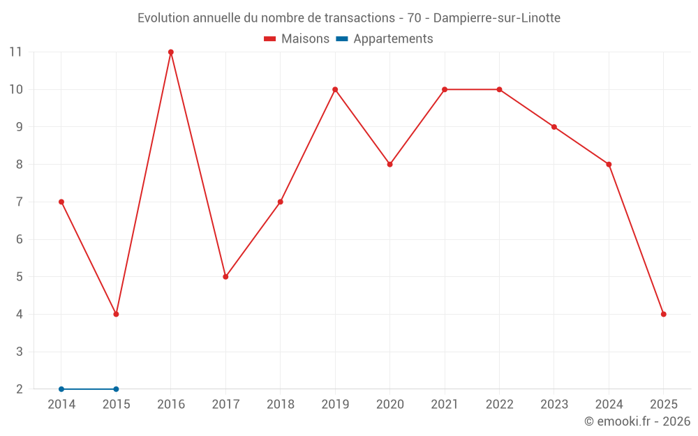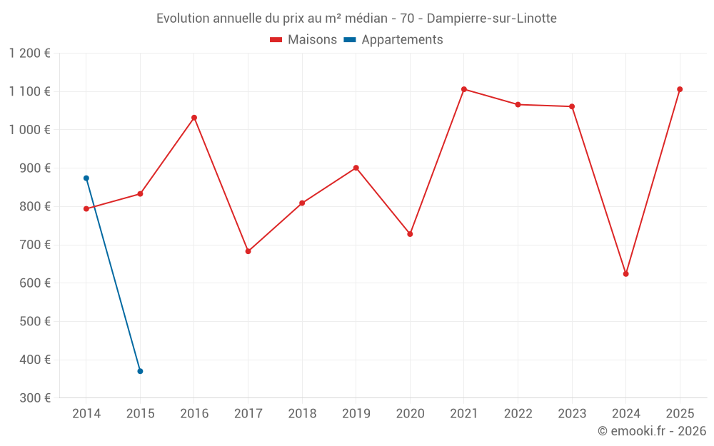 Le prix médian sur les 15 transactions de maisons des 24 derniers mois dans la commune de Dampierre-sur-Linotte était de 833 € par mètre carré pour une valeur foncière médiane de 69 000 €. Sur cette période 60% des transactions se sont situées entre 428 et 1 332 € par mètre carré (du 2ème au 8ème déciles).