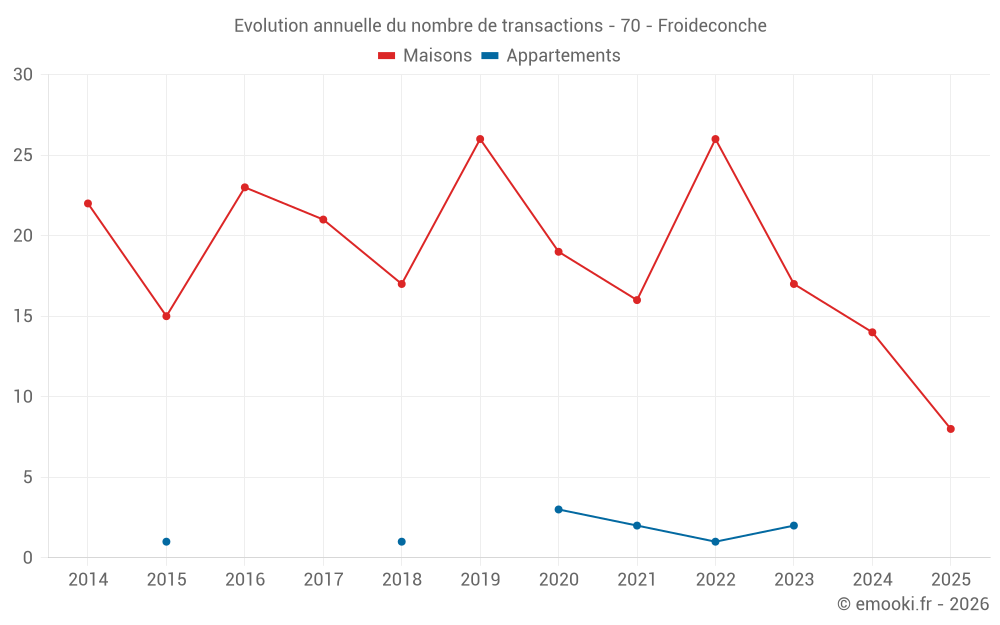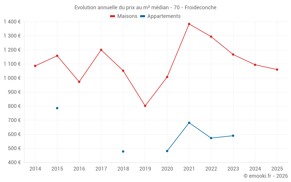 Le prix médian sur les 17 transactions de maisons des 12 derniers mois dans la commune de Froideconche était de 1 077 € par mètre carré pour une valeur foncière médiane de 92 000 €. Sur cette période 60% des transactions se sont situées entre 785 et 1 549 € par mètre carré (du 2ème au 8ème déciles).