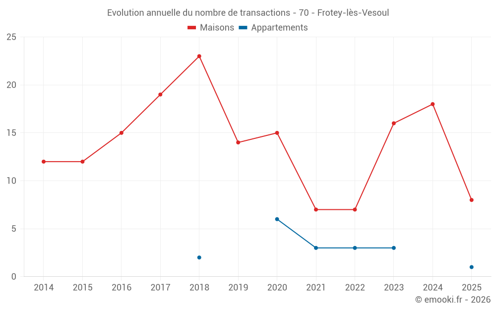 Le prix médian sur les 19 transactions de maisons des 12 derniers mois dans la commune de Frotey-lès-Vesoul était de 1 481 € par mètre carré pour une valeur foncière médiane de 144 500 €. Sur cette période 60% des transactions se sont situées entre 902 et 1 928 € par mètre carré (du 2ème au 8ème déciles).