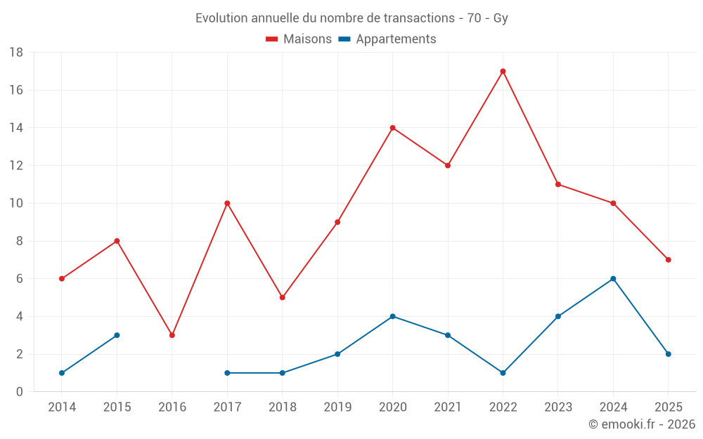 Le prix médian sur les 22 transactions de maisons des 24 derniers mois dans la commune de Gy était de 700 € par mètre carré pour une valeur foncière médiane de 121 250 €. Sur cette période 60% des transactions se sont situées entre 466 et 1 719 € par mètre carré (du 2ème au 8ème déciles).