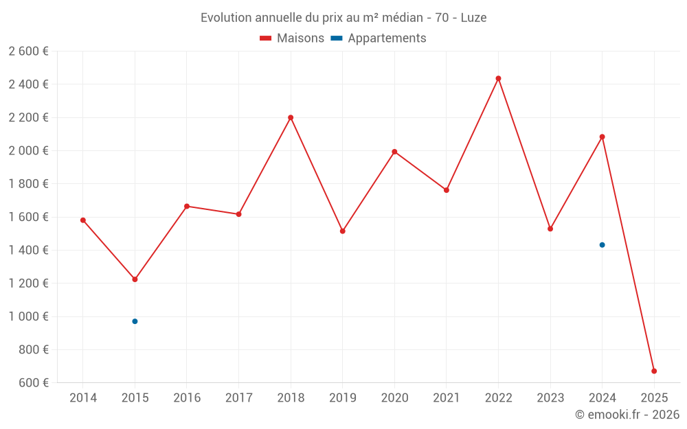 Le prix médian sur les 16 transactions de maisons des 24 derniers mois dans la commune de Luze était de 2 084 € par mètre carré pour une valeur foncière médiane de 190 575 €. Sur cette période 60% des transactions se sont situées entre 1 100 et 2 377 € par mètre carré (du 2ème au 8ème déciles).