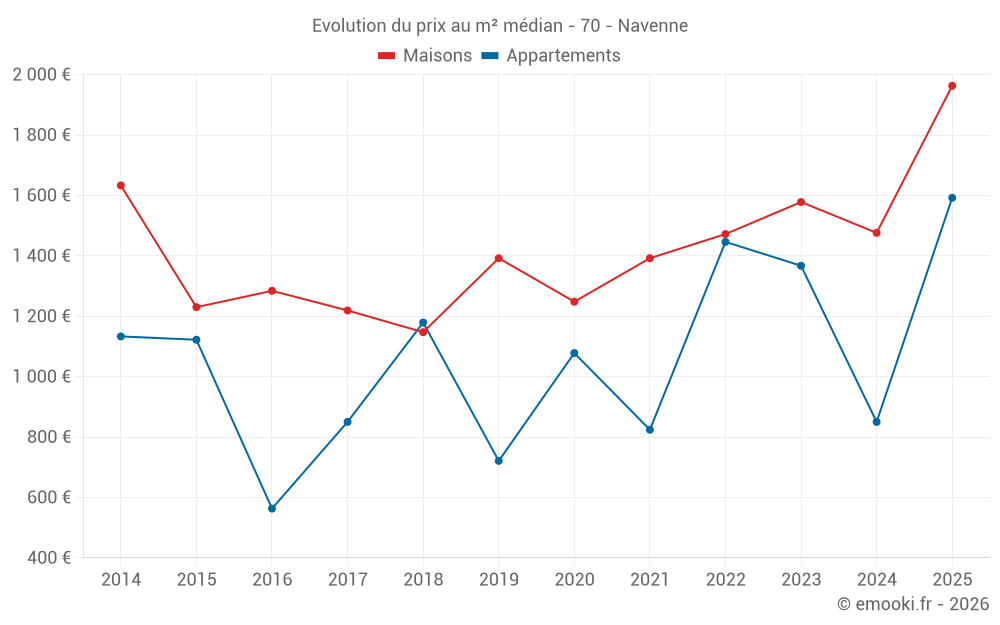 Le prix médian sur les 24 transactions de maisons des 24 derniers mois dans la commune de Navenne était de 1 526 € par mètre carré pour une valeur foncière médiane de 159 250 €. Sur cette période 60% des transactions se sont situées entre 1 249 et 2 059 € par mètre carré (du 2ème au 8ème déciles).