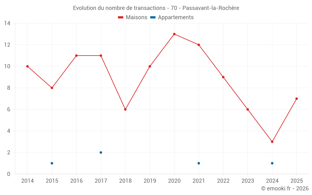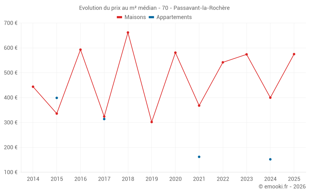 Le prix médian sur les 14 transactions de maisons des 24 derniers mois dans la commune de Passavant-la-Rochère était de 390 € par mètre carré pour une valeur foncière médiane de 39 250 €. Sur cette période 60% des transactions se sont situées entre 193 et 1 023 € par mètre carré (du 2ème au 8ème déciles).