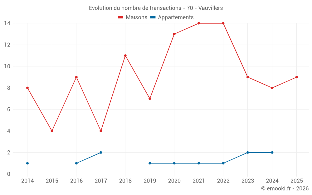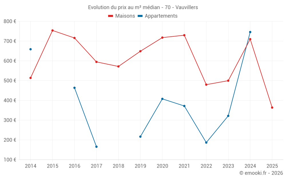 Le prix médian sur les 21 transactions de maisons des 24 derniers mois dans la commune de Vauvillers était de 500 € par mètre carré pour une valeur foncière médiane de 50 000 €. Sur cette période 60% des transactions se sont situées entre 269 et 909 € par mètre carré (du 2ème au 8ème déciles).