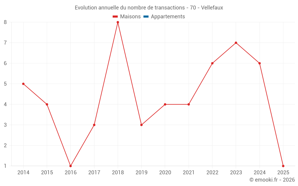 Le prix médian sur les 14 transactions de maisons des 24 derniers mois dans la commune de Vellefaux était de 1 272 € par mètre carré pour une valeur foncière médiane de 139 125 €. Sur cette période 60% des transactions se sont situées entre 952 et 1 812 € par mètre carré (du 2ème au 8ème déciles).