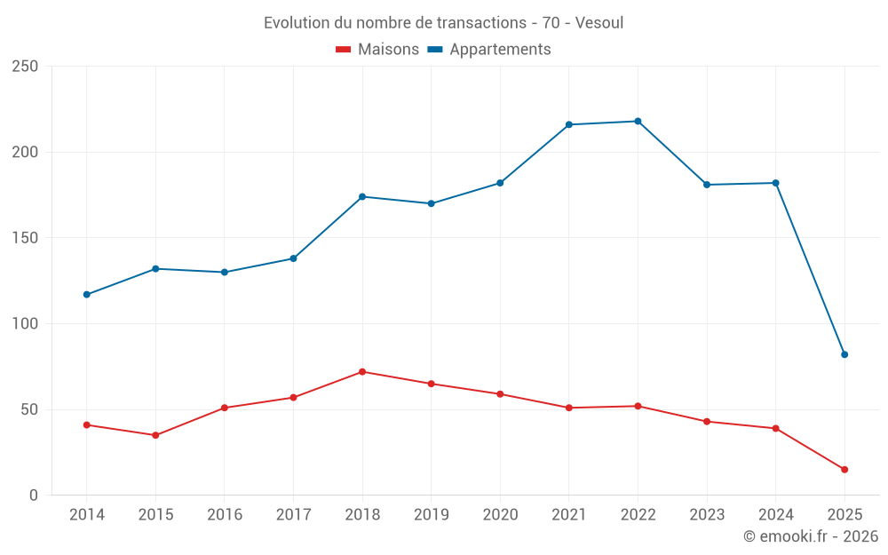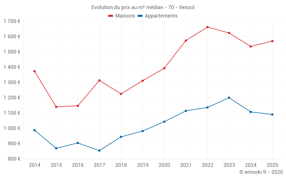 Le prix médian sur les 41 transactions de maisons des 12 derniers mois dans la commune de Vesoul était de 1 539 € par mètre carré pour une valeur foncière médiane de 139 475 €. Sur cette période 60% des transactions se sont situées entre 1 130 et 1 823 € par mètre carré (du 2ème au 8ème déciles).