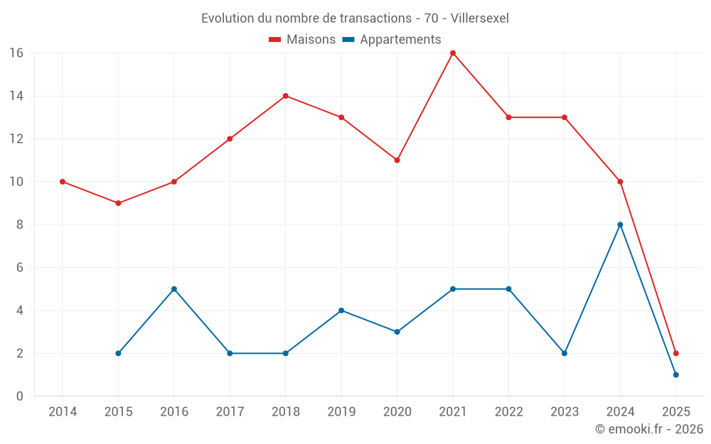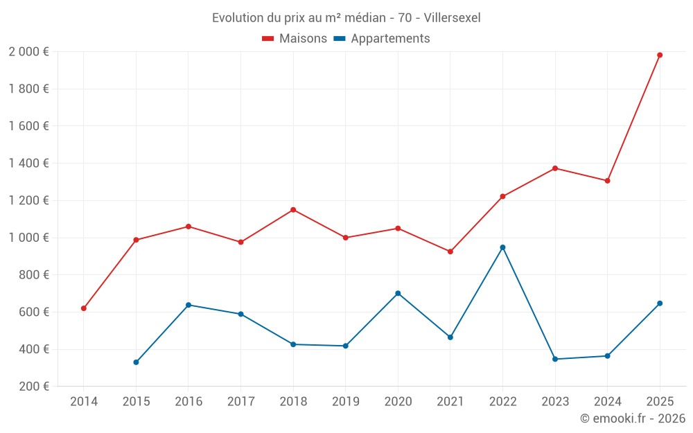 Le prix médian sur les 18 transactions de maisons des 24 derniers mois dans la commune de Villersexel était de 1 226 € par mètre carré pour une valeur foncière médiane de 114 650 €. Sur cette période 60% des transactions se sont situées entre 667 et 1 853 € par mètre carré (du 2ème au 8ème déciles).