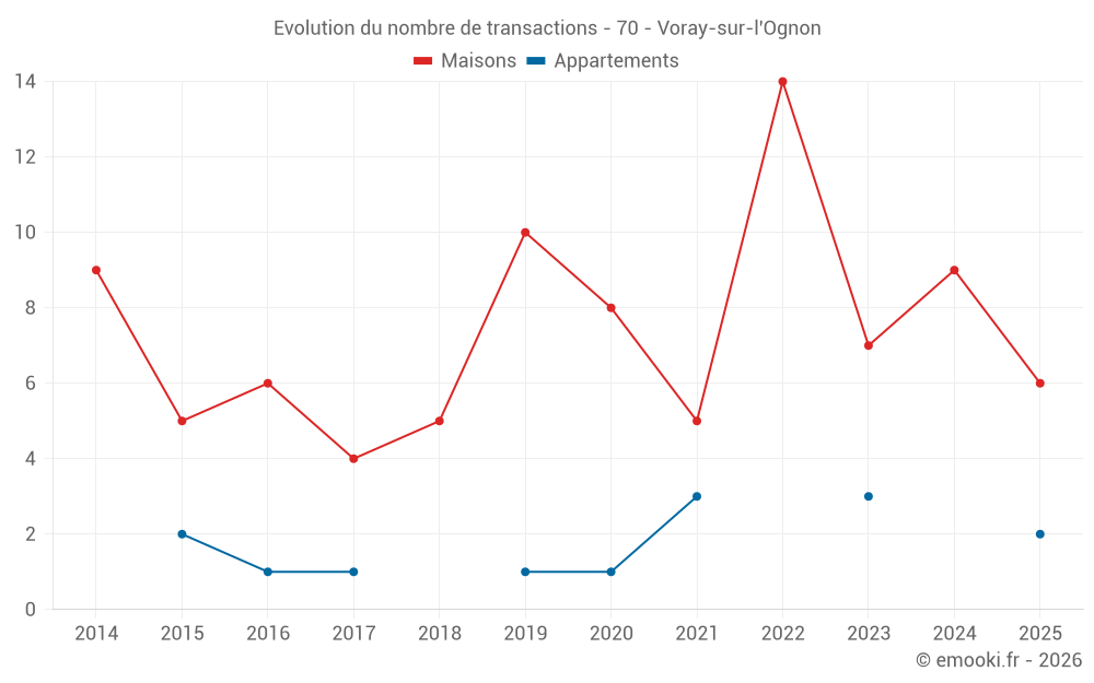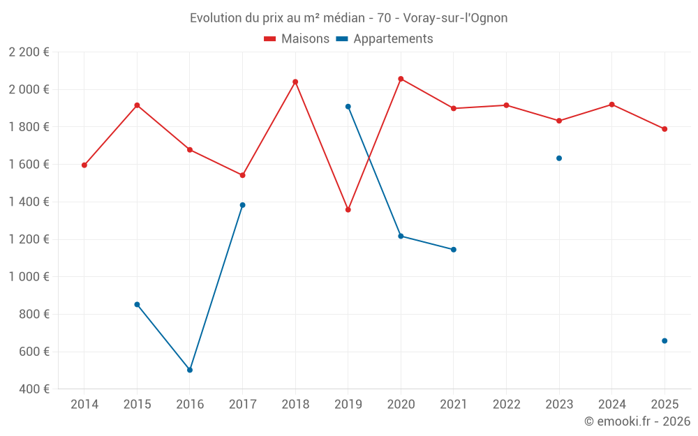 Le prix médian sur les 19 transactions de maisons des 24 derniers mois dans la commune de Voray-sur-l'Ognon était de 1 868 € par mètre carré pour une valeur foncière médiane de 178 800 €. Sur cette période 60% des transactions se sont situées entre 1 686 et 2 379 € par mètre carré (du 2ème au 8ème déciles).