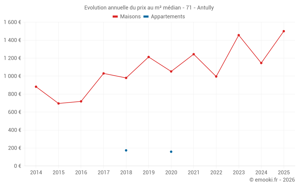 Le prix médian sur les 26 transactions de maisons des 24 derniers mois dans la commune d'Antully était de 1 404 € par mètre carré pour une valeur foncière médiane de 106 100 €. Sur cette période 60% des transactions se sont situées entre 635 et 1 664 € par mètre carré (du 2ème au 8ème déciles).