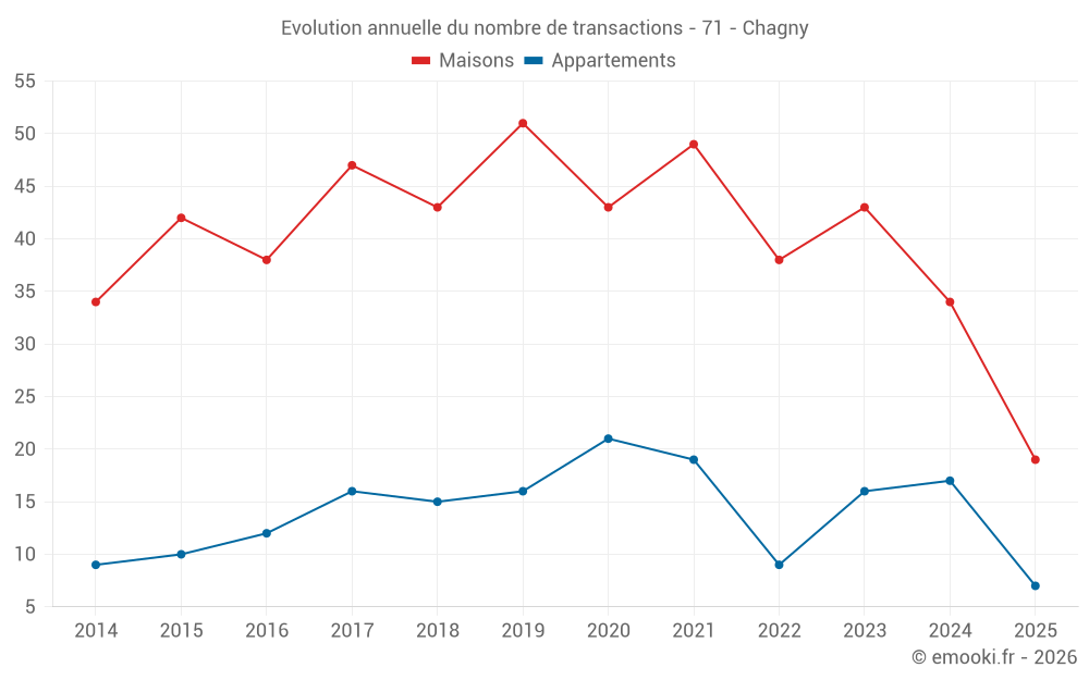 Le prix médian sur les 19 transactions de maisons des 6 derniers mois dans la commune de Chagny était de 1 830 € par mètre carré pour une valeur foncière médiane de 180 000 €. Sur cette période 60% des transactions se sont situées entre 1 034 et 2 384 € par mètre carré (du 2ème au 8ème déciles).