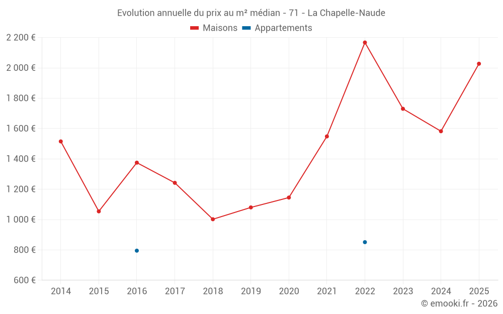Le prix médian sur les 14 transactions de maisons des 24 derniers mois dans la commune de la Chapelle-Naude était de 1 582 € par mètre carré pour une valeur foncière médiane de 150 000 €. Sur cette période 60% des transactions se sont situées entre 996 et 2 240 € par mètre carré (du 2ème au 8ème déciles).