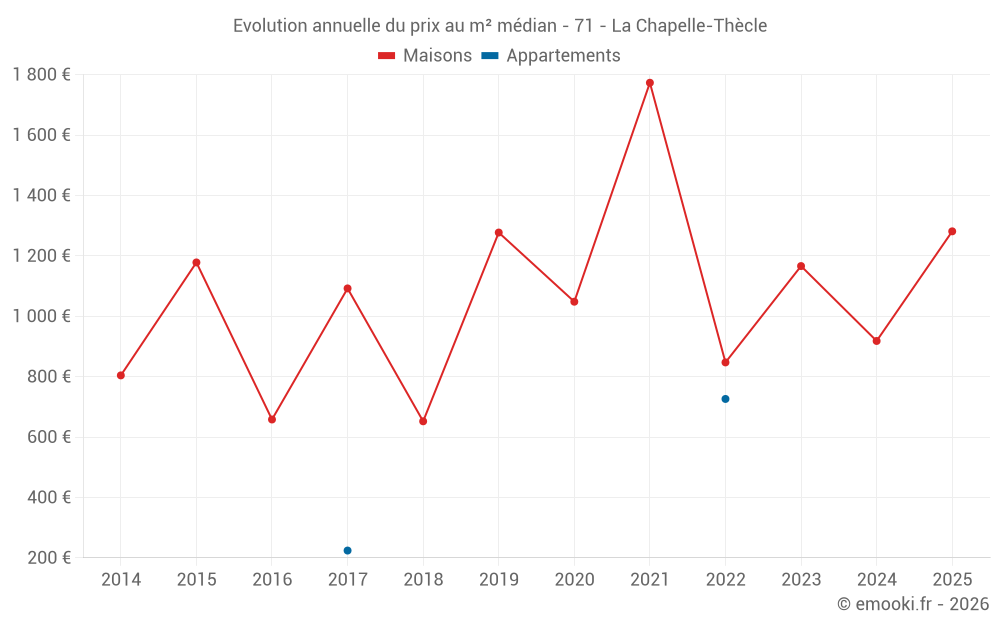 Le prix médian sur les 25 transactions de maisons des 24 derniers mois dans la commune de la Chapelle-Thècle était de 1 153 € par mètre carré pour une valeur foncière médiane de 95 000 €. Sur cette période 60% des transactions se sont situées entre 662 et 1 561 € par mètre carré (du 2ème au 8ème déciles).